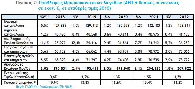 Στις μακροοικονομικές εκτιμήσεις του Μεσοπρόθεσμου Πλαισίου προβλέπεται αύξηση του ΑΕΠ κατά 2% το 2018 (έναντι 2,5% που προέβλεπε ο πρϋπολογισμός), 2,4% το 2019, 2,3% το 2020, 2,1% το 2021 και 1,8% το 2022.