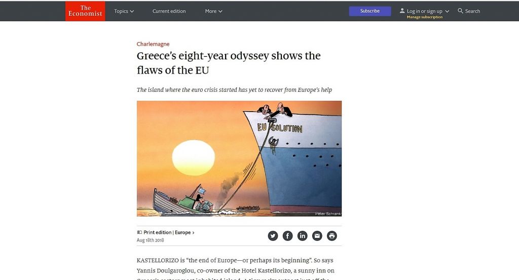 Με αφορμή την επικείμενη έξοδο της χώρας από το τρίτο πρόγραμμα διάσωσης και με αναφορές στις δηλώσεις του τότε Έλληνα πρωθυπουργού, Γ.Παπανδρέου από το Καστελόριζο, όταν η κρίση ξεκινούσε και εκείνος έκανε λόγο για μια νέα Οδύσσεια, το βρετανικό περιοδικό Economist εκτιμά ότι θα ήταν ωραία να νομίζει κανείς ότι οι περιπέτειες της Ελλάδας θα έχουν παρόμοια κατάληξη με αυτή του Οδυσσέα.