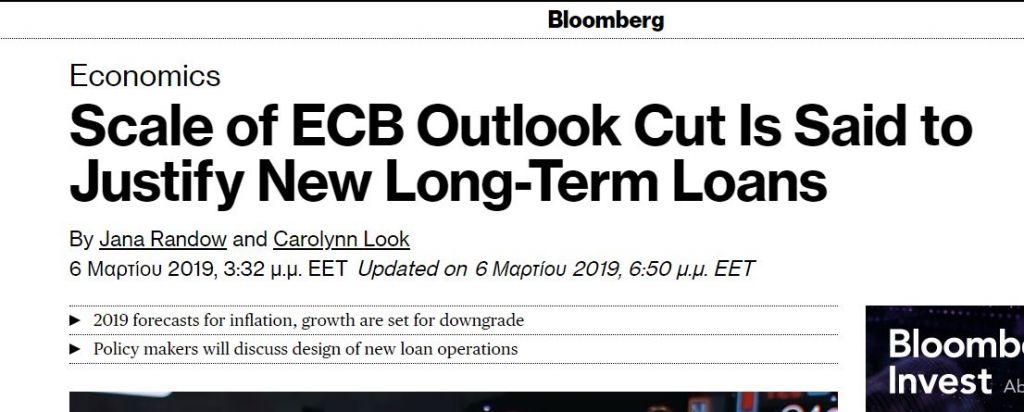 Όπως μεταδίδει το Bloomberg, σύμφωνα με πηγές που έχουν γνώση του θέματος, οι αξιωματούχοι της ΕΚΤ είναι έτοιμοι να περικόψουν τις οικονομικές προβλέψεις τους για την ανάπτυξη της ευρωζώνης αρκετά, ώστε να δικαιολογείται η προώθηση ενός νέου προγράμματος δανείων προς τις τράπεζες (TLTROs).